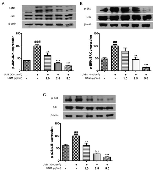 MAPKs are involved in regulating the expression and production of MMPs. Rittie and Fisher [36] reported that oxidative stress resulting from ROS accumulation activates MAPK signaling through MAPK phosphorylation. Recent studies have shown that UVB-induced collagen breakdown is significantly ameliorated by inhibition of MAPK signaling [37,38]. As shown in Figure 5, UVB irradiation promoted MAPK phosphorylation, including that of p-JNK, p-ERK, and p-p38 MAP kinase. In contrast, USM treatment significantly inhibited the UVB-induced activation of JNK, ERK, and p38. Treatment with 5 µg/mL USM decreased the levels of p-JNK, p-ERK, and p-p38 by 80.3, 87.2, and 84.7%, respectively.