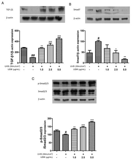 TGF-β is the major activator of collagen synthesis in human skin fibroblasts. The TGF-β type 1 receptor initiates the synthesis of type 1 procollagen [39]. UV irradiation impairs TGF-β and Smad2/3 signaling, decreasing type 1 procollagen synthesis, and leads to the loss of collagen in the dermis [11]. Smad7 down-regulates TGF-β/Smad signaling through a mechanism of feedback inhibition and reduces the stability of the TGF-β receptor, as well as the activation of Smad2/3 [40,41]. Kim et al. showed that UVB irradiation downregulates the levels of TGF-β and Smad2/3, but that red raspberry reversed this effect [37]. Similarly, in our study, UVB irradiation also reduced the expression of TGF-β and Smad2/3, whereas USM treatment resulted in the upregulation of TGF-β and Smad2/3 (Figure 6). In contrast, Smad7 expression was upregulated following UVB irradiation. However, USM treatment resulted in the downregulation of Smad7 by 32.2, 53.1, and 83.1%, respectively. Therefore, we suggest that USM may protect against UVB-induced collagen degradation through the regulation of TGF-β/Smad signaling.
