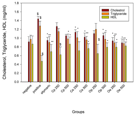 Liver plays a fundamental role in the metabolism of phospholipids. The elevated MDA values in CCl4 intoxicated rats were significantly decreased in all of the pretreated groups in a dose dependent manner. The ethanolic extract of C. oliviforme (Oe), at the higher dose level (500 mg/kg), was found to be the most effective extract in terms of lipid peroxidation inhibition (Table 1). A marked decrease in triglyceride and total cholesterol levels and an increase in HDL level were recorded in liver-injured rats upon treatment with both the petroleum ether and defatted ethanolic extracts of the leaves of the two plants, as shown in (Figure 1), indicating a significant protective effect on liver through managing proper lipid metabolism. Noteworthy is that the defatted ethanolic extract (Oe) at a dose of 500 mg/kg was found to be the most pronounced extract in restoring the altered lipid profile due to CCl4-injury by decreasing cholesterol, triglyceride levels, and increasing HDL level with comparable potency to silymarin; 1.06, 1.03, and 1.19, respectively. The injection of CCl4 caused a significant disruption to phospholipids metabolism, an increase in TC, TG, and a significant decrease in HDL levels. The increase in cholesterol level might be due to an increased esterification of fatty acids, inhibition of fatty acid β-oxidation, and decreasing cell lipids excretion []. From another point of view, the pretreatment of liver-damaged rats with defatted ethanolic or petroleum ether extracts of two plants might inhibit the harmful effects of free radicles and prevent cell membrane oxidation. This action is expected to decrease acetate transportation to liver cells, which results in a decrease in cholesterol, triglycerides, and free fatty acid synthesis. As a synergy, increasing HDL levels by the plant extracts is an action that is expected to mediate acetate breakdown by the liver and, hence, decrease the lipid levels [].
