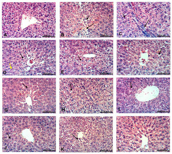 Photomicrographs of the tested extracts effect on liver tissues in CCl4-induced liver injury model in rats (H & E × 400); (A): Liver of normal rat from control –ve group showing apparent normal hepatic lobule. (B): Liver of untreated rat from control +ve group showing stenosis (small arrow). (C): Liver of untreated rat from control +ve group showing necrosis of sporadic hepatocytes (small arrow) and strands of fibroblasts proliferation (large arrow). (D): Liver of rat from standard group (silymarine) showing Kupffer cells activation (yellow arrow) and fatty change of some hepatocytes (large arrow). (E): Liver of rat from Cp 250 group showing fatty change of hepatocytes. (F): Liver of rat from Cp 500 group showing slight vacuolation of sporadic hepatocytes. (G): Liver of rat from Ce 250 mg/kg group showing Kupffer cells activation. (H): Liver of rat from Ce 500 mg/kg group showing very slight cytoplasmic vacuolization of hepatocytes. (I): Liver of rat from Op 250 mg/kg group showing slight vacuolization of sporadic hepatocytes. (J): Liver of rat from Op 500 group showing Kupffer cells activation. (K): Liver of rat from Oe 250 mg/kg group showing very slight vacuolization of hepatocytes. (L): Liver of rat from Oe 500 mg/kg group showing no histopathological changes.