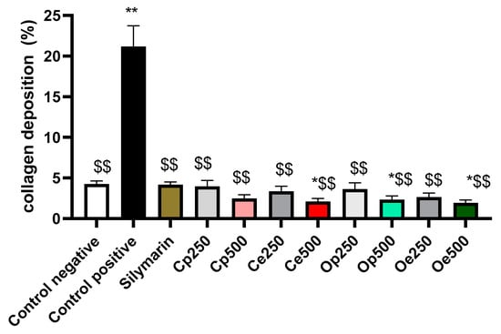 The measurement of the collagen deposition percentage of the tested extracts on liver tissues in CCl4-induced liver injury model in rats (Masson’s Trichrome stain × 10); determined using Image J software (http://rsbweb.nih.gov/ij/download.html). * Statistically significant as compared to control negative (P < 0.05), ** highly Statistically significant as compared to control negative (P < 0.005). $$ Statistically significant compared to control positive at p < 0.005.