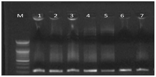 The electrophoresis of DNA fragments isolated from livers of treated rats. M refers to 100 bp DNA ladder, lane 1: control negative group; lane 2: control positive group; lane 3: silymarine group; lane 4: Ce 500 mg/kg group; lane 5: Cp 500 mg/kg group; lane 6: Oe 500 mg/kg group; lane 7: Op 500 mg/kg group.