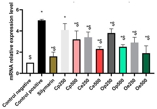 The mRNA level of the gene encoding TGF-β was measured while using qPCR. The results revealed that CCl4 intoxicated rats had marked increase in the TGF-β transcription level. Nevertheless, a significant reduction in TGF-β transcription level was observed in the treated groups, when compared to the positive control group. The values showed to be 1.9, 2.3, 2.5, and 3.2 for Oe, Ce, Op, and Cp, respectively (Figure 7), indicating the superior potency of C. oliviforme ethanolic extract (Oe) (potency relative to silymarin; 0.91).