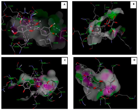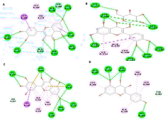 Molecular interaction of quercetin (A), isoquercitrin (B), myricetin (C), and kaempferol (D) with TGF-β1 receptors (PDB ID: 2QD9).