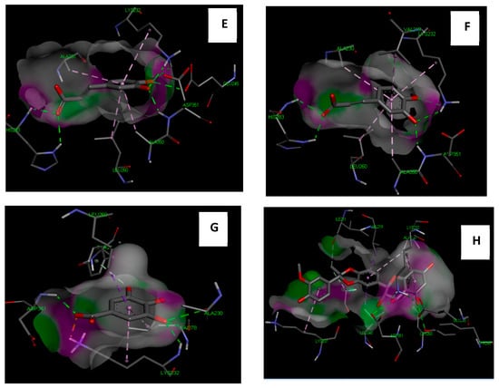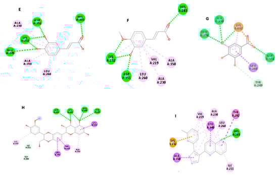 Molecular interaction of caffeic acid (E), trans-ferulic acid (G), gallic acid (H), and silibinin (I) with TGF-β1 receptors (PDB ID: 2QD9).