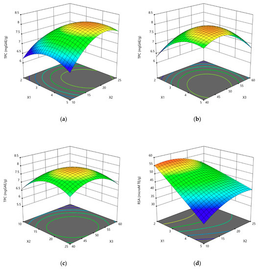 The extraction yield of the total phenolic content (YTPC) and the antioxidant activity (YRSA) against the three variables (X1, X2, and X3) were evaluated using a polynomial second-order model based on the equation used in response surface analysis to predict the optimum conditions for the extraction process: