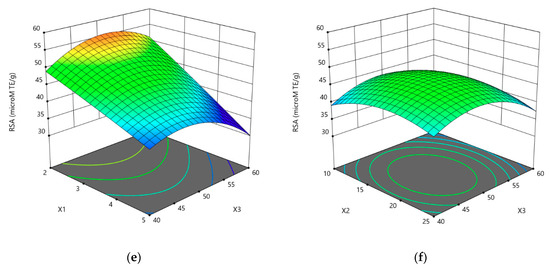 The solid:solvent ratio, extraction duration, and ethanol concentration had significant linear and quadratic effects on TCP values, while only the solid:solvent ratio and ethanol concentration had significant linear effects on RSA values. The quadratic effects of extraction duration and ethanol concentration are also significant for RSA values. Generally, the interactions between two variables were not significant, except for RSA (X1X2 and X2X3). The relationships between independent variables and TPC or RSA values were illustrated by a three-dimensional representation of the response surface (Figure 1a–f).
