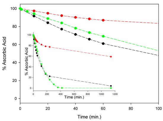 - Wilson, R.J.; Beezer, A.E.; Mitchell, J.C. A Kinetic study of the oxidation of l-ascorbic acid (vitamin C) in solution using an isothermal microcalorimeter. Thermochim. Acta 1995, 264, 27–40. [Google Scholar] [CrossRef]