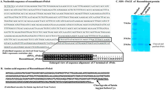 Details of nucleotide sequence of plasmid expressing recombinant rat peroxiredoxin 6 (rPrdx6). The 5′ terminal underlined and italics indicate the derived primer that was used. The 3′ terminal sequence is vector derived nucleotides after recombinant cloning. Inset view shows the different nucleotides of recombinant plasmid to cDNA sequence of rPrdx6 at 3′ terminal (A). The amino acid sequence of the prepared construct contains an intein tag for purification. Underlined sequence encodes for the vector derived amino acids. The cleavage site of the protein from purification tag is shown with an arrow (B). Sodium dodecyl sulfate polyacrylamide gel electrophoresis (SDS-PAGE) of purified Prdx6 using chitin affinity chromatography. The purity is more than 90% (C).