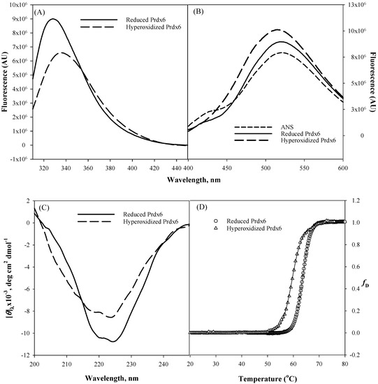 Tryptophan fluorescence (A), 8-Anilinonaphthalene-1-sulfonate (ANS) fluorescence (B), Far-Ultraviolet (UV) Circular Dichroism CD (C) measurements, and normalized thermal-induced denaturation curves (D) of reduced Prdx6 and hyperoxidized Prdx6. All measurements were done at pH 7.4 (50 mM Tris-HCl, 100 mM NaCl) and at 25 °C. Thermal denaturation was recorded following changes in [θ]220 from 20 °C to 80 °C at a rate of 1 °C/min. All spectra are the mean of three independent experiments.
