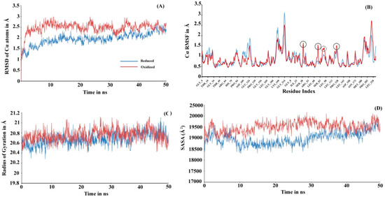 (A) RMSD, (B) RMSF, (C) Radius of gyration and (D) SASA plot of reduced (blue) and hyperoxidized (red) Prdx6 Cα atoms along the 50 ns simulation period. RMSD: Root mean square deviation; RMSF: Root mean square fluctuation; SASA: Solvent accessible surface area.