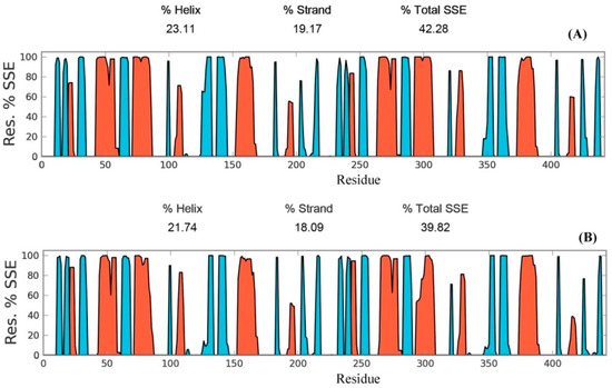 Secondary structure elements evolution of reduced (A) and hyperoxidized (B) Prdx6 during the simulation period. Helices are shown in red and strands are shown in cyan.