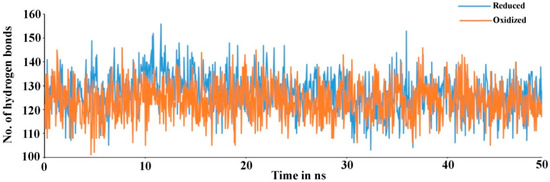 Total number of hydrogen bond found in reduced (blue) and hyperoxidized (orange) Prdx6 during the simulation period.