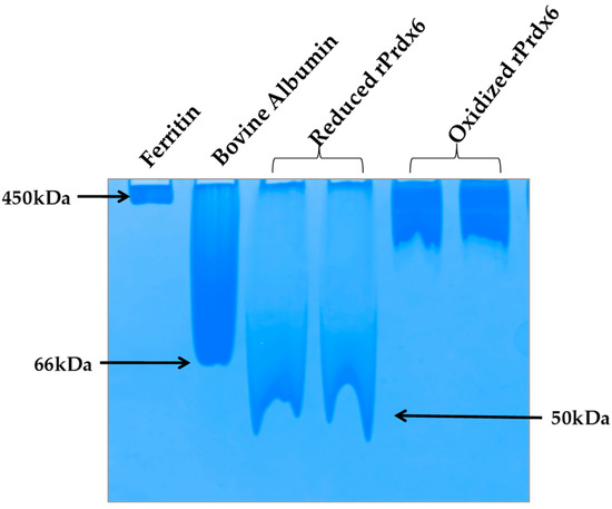 Native-PAGE.Reduced and hyperoxidized Pdrx6s along with bovine serum albumin and horse ferritin as a marker under non-reducing and non-denaturing conditions in the buffer 150 mM beta- alanine and 100 mM lactic acid (85–90%), pH 3.8.