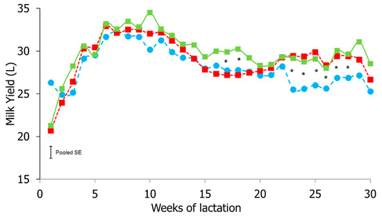 Overall, daily milk yield averaged 28.1 ± 0.40, 29.0 ± 0.48, and 29.9 ± 0.46 L/cow/day in the Control, YM 250, and YM 500 groups, respectively. While no significant effect of treatment was observed on milk yield, as expected, milk yield was significantly different over time (p < 0.001). Although the YM 500 supplemented cows produced an extra average of 1.79 L of milk per week than the cows in the Control group, this difference was not significant. A significant effect of the interaction time of sampling × treatment (p < 0.05) was noted on milk yield, in that the YM 500 group presented higher weekly milk yield levels that the YM 250 and Control groups in Weeks 17 and 18, and that both YM 250 and YM 500 groups had higher weekly milk yield values than the Control group in Weeks 23 to 28 (Figure 1).