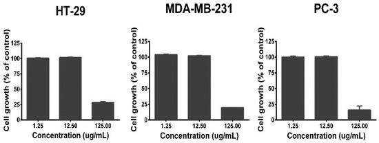 Antiproliferative activity of the extract obtained from the ‘sugar mango’ seed coat. Cell lines: HT-29 (colorectal adenocarcinoma), MDA-MB-231 (breast adenocarcinoma), and PC-3 (prostate cancer).