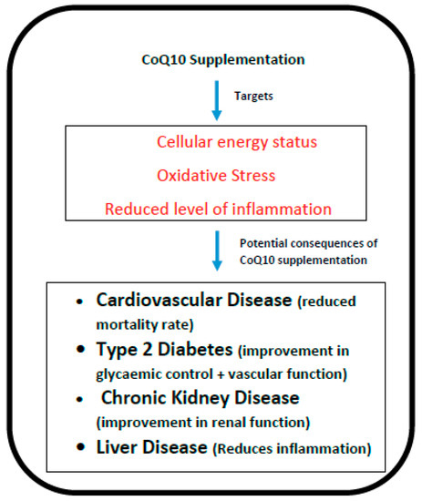 In addition to reducing the risk of cardiovascular problems in patients with liver disease, CoQ10 supplementation may also benefit the disease process within the liver by reducing inflammation and oxidative stress. For example, one of the principal mechanisms by which alcohol causes liver damage is via the generation of free radicals, and the antioxidant action of CoQ10 can help to protect liver cells from such oxidative damage [59]. Free radical induced oxidative stress has similarly been implicated in the pathogenesis of NAFLD [60].