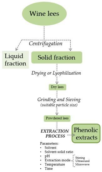 Some papers on the phenolic extraction from wine lees found in literature have been summarized in Table 1. In Figure 1, the illustrated process scheme in reference to Table 1 is shown.