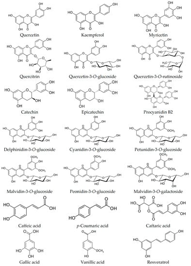 Individual phenolic compounds belonging to flavonoids (flavanols, flavonols, and anthocyanins), phenolic acids, and stilbenes have been identified and quantified in wine lees. Figure 2 shows some chemical structures belonging to phenolic compounds identified in wine lees. Wine lees are a reliable source of flavonols such as quercetin, quercitrin, kaempferol, and myricetin. According to literature [28], the major flavonol is quercetin with an amount of 42 μg/g DM, while kaempferol and myricetin show lower values (10 and 8 μg/g DM, respectively). Other flavonols detected in wine lees include kaempferol 3-(2′,3′-diacetylrhamnoside)-7″-rhamnoside, quercetin 3-O-glucoside, quercetin 3-O-glucuronide, quercetin 3-O-galactoside and quercetin 3-O-rutinoside [2,25,32]. In wine lees from Vitis labrusca varieties, laricitrin, isorhamnetin, and syringetin, and their glucosides, as well as myricetin derivatives (myricetin 3-O-glucuronide and myricetin 3-O-glucoside) were found [2].