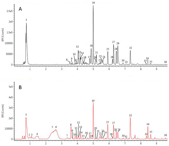 The base peak ion chromatograms (BPI) of soaked (A) and germinated (B) peanut extracts. Numbers indicate peaks of compounds found in extracts.