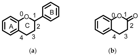 The backbones of flavonoids (a) and coumarins (b), and their potential cleavage bones marked with numbers. A, ring A; B, ring B; C, ring C.