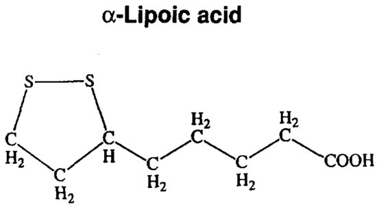 LA, is a naturally dithiol compound synthesized enzymatically in the mitochondria from octanoic acid and a sulfur source [62,63]. The molecular structure of LA is represented in Figure 2.
