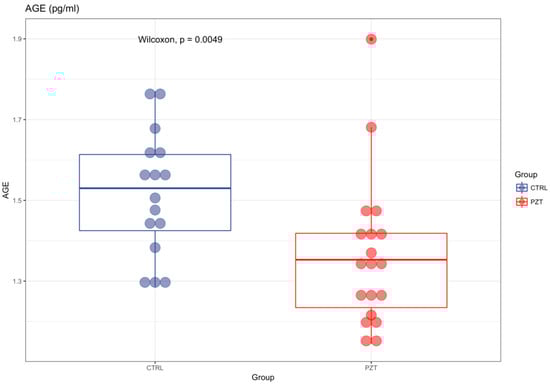 We decided to assess the fluorescent AGE by the spectofluorimetric method because fluorescent AGEs (fAGEs) are considered a subset remarkably representative of the entire AGE family and fAGEs can be easily assessed in sera [,]. Serum was diluted 1:5 with phosphate-buffered saline (PBS: pH 7.4), and fluorescence intensity was recorded at maximum emission (440 nm) upon excitation at 350 nm and expressed in arbitrary units (AU). The serum concentration of AGEs was normalized to the total protein amount determined by the Bradford assay and expressed in AU for protein gram. Each sample was analyzed in duplicate for determination (Tables S2 and S3).