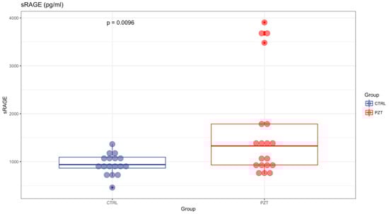 sRAGE was significantly elevated in patients affected by multiple myeloma (MM) compared to healthy subjects (1686.3 pg/mL ± 1107 vs 940.67 pg/mL ± 218; p < 0.01).