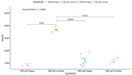 The Kruskal-Wallis H test showed that there was a statistically significant difference in sRAGE according to the heavy and light chain (Figure 3): X2(3) = 11.434, p = 0.0096. IgA lambda had significantly higher sRAGE values than IgA kappa, IgG kappa, and IgG Lambda (Wilcoxon rank-sum analysis: p = 0.081, p = 0.0043, p = 0.012, respectively).
