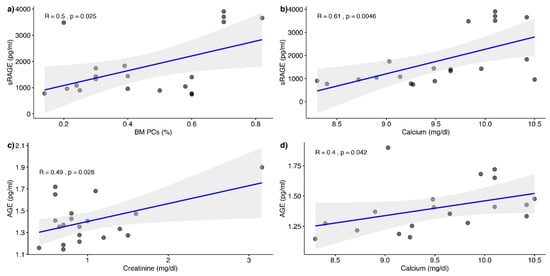 In our study, AGE levels were significantly reduced in patients with respect to controls, while sRAGE concentrations were significantly elevated in patients affected by MM compared to healthy subjects. Moreover, we found a correlation between the levels of AGE and two of the parameters used to evaluate organ damage, such as creatinine and calcium, and a correlation between sRAGE and calcium (Figure 4).