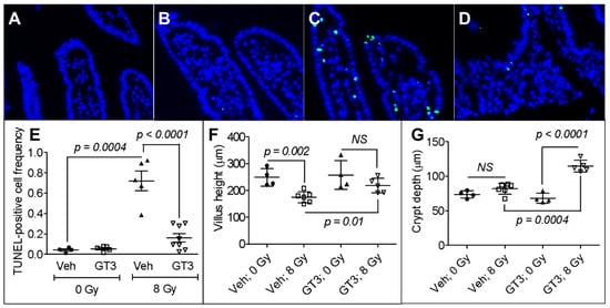3.1. GT3 Pretreatment Attenuated Intestinal Cell Death, Maintained Villus Height, and Enhanced Crypt Depth in Irradiated Mice