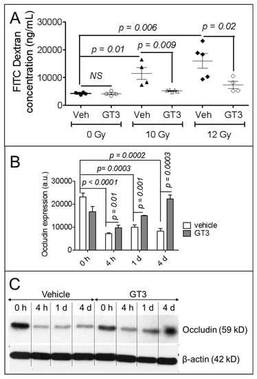 3.2. GT3 Pretreatment Restored the Intestinal Barrier and Upregulated the Level of Occludin Protein in Irradiated Intestinal Tissue