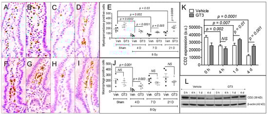3.3. GT3 Pretreatment Rescued Populations of Intestinal Neutrophils, Macrophages, and Lymphocytes