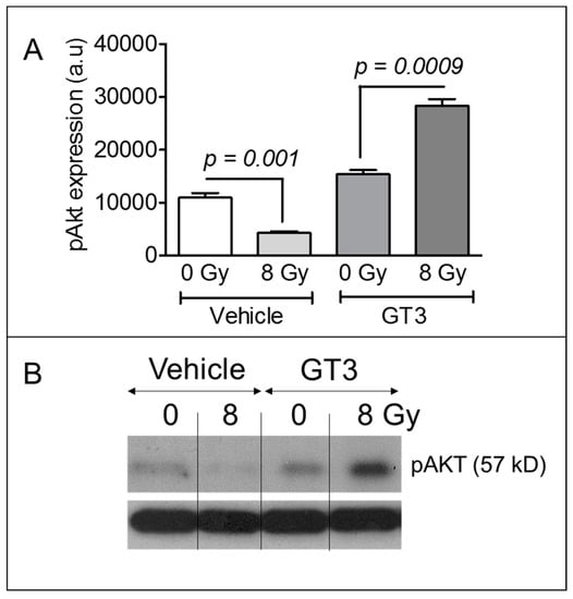 3.5. GT3 Pretreatment Enhanced AKT Phosphorylation on Day 4 after Irradiation