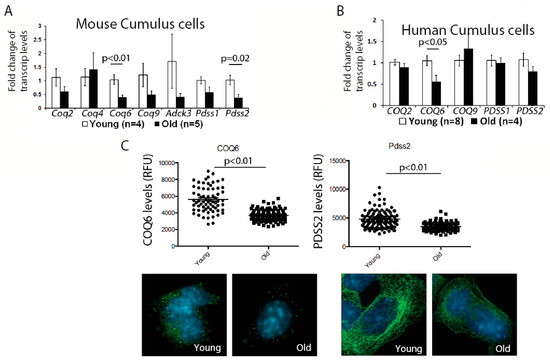 First, we examined the expression of genes involved in the CoQ10 synthesis pathway in the murine cumulus cells. While there was some variability in the expression of all transcripts examined, possibly reflecting biological variability of aging, we observed a significant reduction for the two transcripts—Coq6 and Pdss2; (Figure 1A). We, next, confirmed that the protein levels for both of these enzymes were also significantly decreased (Figure 1C). Similar to mouse, human cumulus cells obtained from older patients also had a significantly lower expression of the COQ6 transcript, while changes in the PDSS2, did not reach significance (Figure 1B). These results suggest that a suboptimal CoQ environment might exist in both the aged oocytes and the cumulus cells.