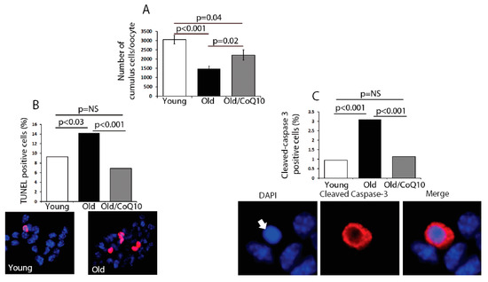 Aging impacts cumulus cell number via regulation of apoptosis. (A) Number of cumulus cells per oocyte declined with aging, but this was significantly improved after CoQ10 supplementation. Pooled cumulus cells from the same mouse were counted and divided by the number of ovulated oocytes, per female, to obtain the number of cells per oocyte. Values represent mean ± SEM from young (n = 15), old (n = 10), and old-CoQ10 mice (n = 8), per oocyte, per female. (B) Proportion of TUNEL and cleaved caspase-3-positive cumulus cells. Approximately 1,000 cells were counted in each category and these were generated by pooling cumulus cells from oocytes from three different females. Increased apoptosis of cumulus cells, with aging, with a protective effect of CoQ10. Representative images are shown below the graph (DAPI—blue, TUNEL—red). (C) Proportion of cleaved caspase-3 positive cells in each age category: images below demonstrate apoptotic cumulus cell (arrow), with the picnotic nucleus-stained positive for cleaved caspase-3 obtained from old females, as an example of staining (magnification 400×). NS: not significant.