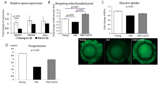 Reduced cumulus cells metabolism function with aging. (A) Fold change of the mRNA levels of genes involved in oxidative phosphorylation, with a significant reduction of Ndufs3 expression in cumulus cells from old mice. Data shown were generated from the same samples as those in Figure 1 A. (B) Mitotracker Red signal measured in live cumulus cells from a merged pool of cells of numerous oocytes, of at least three females. Aging significantly decreased the mitochondrial respiring pool and CoQ10 supplementation increased the respiring mitochondria. The values are expressed as mean ± SEM of the fold change in fluorescence units per cell, compared to the young group (n = 192 for young; n = 208 old; and n = 33 for CoQ10, magnification 400×). (C) Glucose uptake by cumulus cells is reduced with aging, but can be improved by CoQ10 supplementation. Images below demonstrate the cumulus–oocyte complexes at the germinal vesicle stage, stained with florescent glucose (6-NBDP), and are expressed as fold change of random fluorescence units, adjusted to the young group (n = 65 regions from 20 young cumulus–oocyte complex (COCs), n = 49 regions from 15 COCs for old, and n = 44 regions from 14 COCs from Old/CoQ10; magnification 200×). (D) Progesterone production is decreased in aged cumulus cells and is restored by in vivo treatment of females with CoQ10. Cumulus cells were pooled from at least three females, for each treatment group, and plated on 96 well plates with n = 18 young, n = 9 for old, and n = 8 for old/CoQ10.