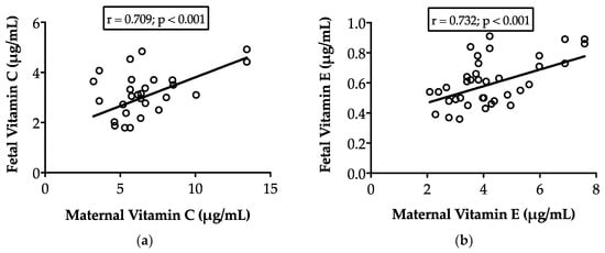Oral maternal supplementation with vitamins C and E increased maternal plasma concentrations of both vitamins (p < 0.05), irrespective of pregnancy rank (Table 1). Our data also showed that both vitamins were directly transferred to the fetuses since there was a strong positive correlation, in both non-supplemented control and supplemented fetuses, between maternal and fetal concentrations of vitamin C (r = 0.709; p < 0.001) and vitamin E (r = 0.732; p < 0.001), as depicted in Figure 1. Hence, maternal supplementation with vitamins C and E also increased the concentrations of both vitamins in the samples obtained from fetal cord blood. Consequently, treated fetuses showed higher concentrations of vitamin C (3.58 ± 1.17 µg/mL vs. 2.84 ± 0.72 µg/mL in the control group; p < 0.01) and vitamin E (0.66 ± 0.15 µg/mL vs. 0.55 ± 0.13 µg/mL in the control group; p < 0.05) (Table 1).