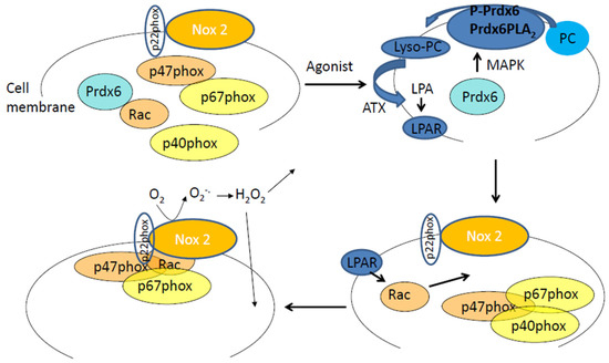The Prdx6–PLA2 activity and the production of reactive oxygen species (ROS) by endothelial cells in response to an agonist. In the cytosol are Prdx6 and cytosolic subunits of NADPH 2 oxidase (p40phox, p67phox, p47phox, and Rac). Upon phosphorylation (in response to an agonist, Angiotensin II, or LPS) Prdx6 translocates to the plasma membrane. P-Prdx6 has phosphospholipase A2 activity via which it hydrolyses membrane phosphatidylcholine (PC) to lysophosphatidylcholine (lyso-PC). Lyso-PC is catalyzed to lysophosphatidic acid (LPA) by the enzyme autotaxin (ATX). LPA binds to its receptor on the cell membrane, and the resulting signaling cascade leads to Rac phosphorylation that in turn enables assembly of the cytosolic components of NADPH oxidase 2 with the membrane bound components (gp91phox or Nox2 and p22phox). The assembled enzyme reduces molecular oxygen to superoxide which then dismutates to hydrogen peroxide. H2O2 can participate in extracellular and intracellular signaling cascades.