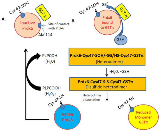 Illustration of the Peroxidase activity of Prdx6. A. Inactive Prdx6: its active site (Cys 47) needs to be oxidized to Cys-sulfenic acid (Cys47-SOH). B. After oxidation of Cys47 to sulfenic acid (-SOH), the Prdx6 forms a heterodimer with thiolate anion (via GSTπ). S-glutathionylation of the heterodimer, followed by its alignment with the catalytic Cys47 of GSTπ, results in the formation of a disulfide-based heterodimer. Reduction of this disulfide bond by GSH causes heterodimer dissociation to active Prdx6 monomer. The active monomer reduces phospholipid hydroperoxide (PLPCOOH) to PLPCOH.