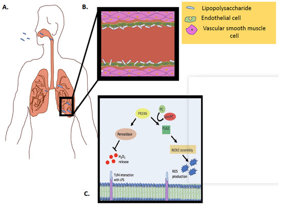 Schematic representation of Prdx6 activity (PLA2 and peroxidase) in vivo, in response to an inflammatory stimulus. (A) LPS inhalation and interaction with pulmonary capillary. (B) LPS inhalation and interaction with endothelial cells in pulmonary capillary. (C) LPS interaction with the endothelial cell membrane and the Prdx6–PLA2 activity as well as the Prdx6–peroxidase activity.