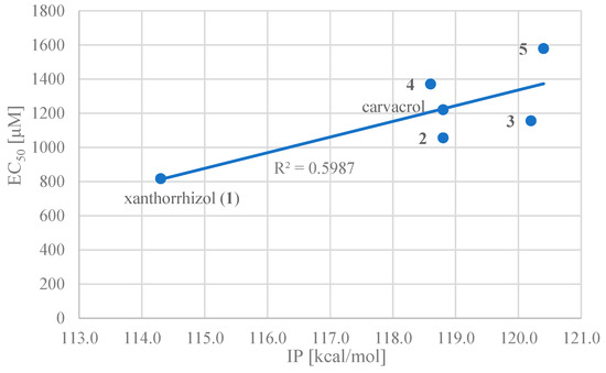 Correlations between each thermodynamic parameter and the EC50 were obtained for carvacrol and compounds 15. The strongest positive correlation (R2 = 0.60) was that of IP (Figure 2). This suggests that IP, and therefore the ET-PT mechanism, is the largest contributor to the DPPH radical scavenging activity of these compounds. This agrees with a previous study that showed that phenolic compounds react through ET-PT mechanisms in polar solvents such as water and alcohols [37,38]. However, in the future, it should be noted that the substrate for generalisation and more accurate calculations need to be expanded in order to reduce uncertainty and errors.