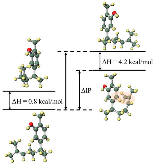 In order to investigate the influence of the side chain on the DPPH radical scavenging activity, the thermodynamic stability of the neutral compound, the radical cation and the positional relationship of the side chain were determined. In the case of xanthorrhizol (1), which has a high radical scavenging ability and the smallest IP of compounds 15, the neutral compound is more thermodynamically stable when the side chain is in the far conformation, but the difference in stability compared to when the side chain is in close conformation is less than 1 kcal/mol. Therefore, the conformation of the side chain does not have a notable influence on the neutral compound. Conversely, the radical cation is more stable when the side chain is in the close conformation, and there is a difference in energy of 4.2 kcal/mol compared with when the side chain is in the far conformation. Therefore, it is conceivable that the functional group on the side chain contributes to the stabilisation of the radical cation (Figure 3). As can be seen in the electron spin density of the radical cation, unpaired electrons are localised in the aromatic ring in the far conformation, whereas unpaired electrons are delocalised into the double-bond moiety on the side chain in the close conformation (Figure 4). In addition, the π orbital of the aromatic ring is stabilised when the side chain is in the close conformation because electrons flow into the aromatic ring from the double-bond moiety of the electron-rich side chain, as can be seen in the orbital lobe diagram (Figure 5). It can therefore be inferred that xanthorrhizol (1) exhibited the smallest IP because of stabilisation of the radical cation through the double-bond moiety on the side chain, and as a result, had a higher radical scavenging ability.