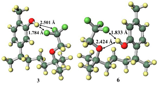 Carvacrol, thymol, and the new synthetic fluoro analogues 3 and 6 were compared in order to evaluate the influence of the phenolic OH group position. Compounds 3 and 6 had lower EC50 values than carvacrol and thymol, respectively. This suggests that the presence of the trifluoroethoxy group on the side chain improves the radical scavenging ability. When the functional group on the side chain was in the close conformation (Figure 6), the radical cation forms of compounds 3 and 6 were stable. However, there is a possibility that the mechanism may completely change due to competition between the groups on the side chains in their interactions, such as hydrogen bonding and intermolecular interaction, with solvent molecules [39,40]. However, intramolecular hydrogen bonding was observed by calculation using the IEF-PCM. Since the fluorine and oxygen atoms of the trifluoroethoxy group stabilised the radical cation by forming hydrogen bonds with the highly cationic hydrogen atom of the phenolic OH group and distortion did not occur, the close conformation was the most stable. This additional stability from the side chain functional group was the reason why compounds 3 and 6 had better EC50 values than carvacrol and thymol.