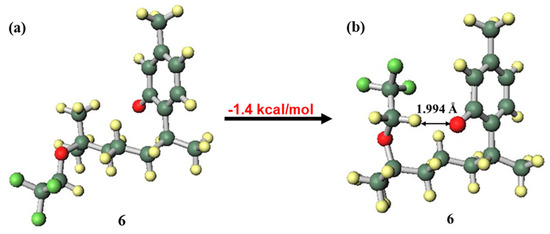 In the structure of the compound 3 anion (Figure 7a), where the side chain was in the close conformation (Figure 7b), hydrogen bonding between a phenolic oxygen atom with anionic properties and the highly acidic hydrogen atom of a methylene in the trifluoromethoxy group was expected to occur. This hydrogen bond would contribute to stabilisation; however, in compound 3, this hydrogen bond was formed with distortion generated in the side chain and aromatic ring. This caused destabilisation, and as a result, the far conformation was the more stable structure. In contrast, since the compound 6 anion can form a similar stabilizing hydrogen bond without distortion (Figure 8), the close conformation was the more stable structure. The fact that compound 6 was more likely than compound 3 to be found in an anionic state because of hydrogen bond stabilisation indicates the increased possibility of radical scavenging progressing through a SPLET mechanism [5,39,40], which could be a factor in the good EC50 value of compound 6. To elucidate the mechanism in more detail, it will be necessary to further investigate curcuphenol analogues.