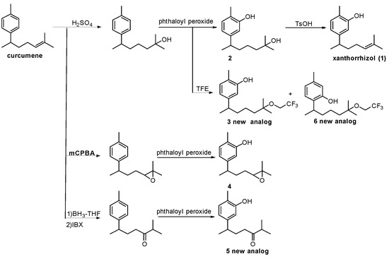 Six phenolic compounds with a bisabolane-type sesquiterpene skeleton, including three novel analogues (compounds 3, 5, and 6), were synthesised (Scheme 1). Xanthorrhizol (1) derivatives were predominantly synthesised over curcuphenol derivatives during the direct oxidation step. The regioselectivity of the oxidation was a result of a preferential reaction on the side with less steric hindrance, which concurs with a previous study [26]. Direct conversion from curcumene to xanthorrhizol was difficult as the olefin was oxidised earlier than the aromatic ring. For this reason, after the olefin was converted to a tertiary OH, the aromatic ring was oxidised and the tertiary OH was converted back to an olefin. The commercially available compounds thymol and carvacrol, containing no side chains, were used as model substrates.