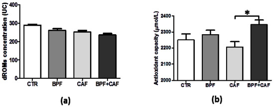 We analyzed the trend of both oxidative stress (d-ROMs) and antioxidant capacity efficiency (BAP) in plasma of CTR, BPF, CAF and BPF + CAF rats. The analysis of the plasmatic oxidative balance shows that the oxidative index is decreased in all treated groups compared to the control (Figure 1a) while the antioxidant capacity effectiveness is considerably decreased in the CAF group and strengthened in the animals treated with BPF (Figure 1b). These results indicate that the CAF diet induces a perturbation of the oxidative equilibrium with an antioxidant capacity depletion as overused. On the contrary, BPF treatment enhances the plasmatic ability to neutralize the oxidative insults, mainly in the case of redox disturbance due to the CAF diet (Figure 1b).