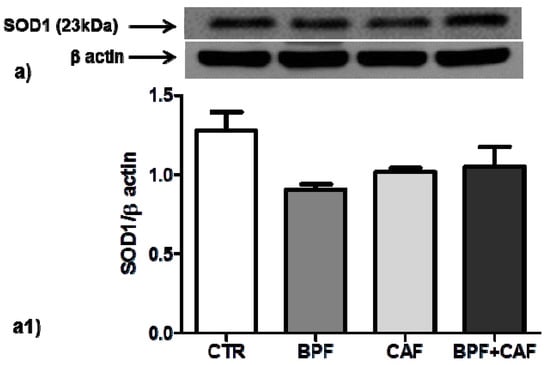 SOD1 expression in rat kidney. Western blotting of SOD1 (a) in the kidney extracts of CTR, BPF, CAF and BPF + CAF rats; (a1) shows the densitometric quantification of the blots. Protein loading was verified by using the anti-β actin antibody. Data are means ± standard deviation (SD) of five determinations for each animal (n = 3). Statistical differences were evaluated by two-way ANOVA followed by Tukey’s multiple comparisons test.