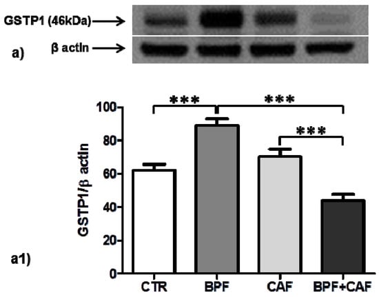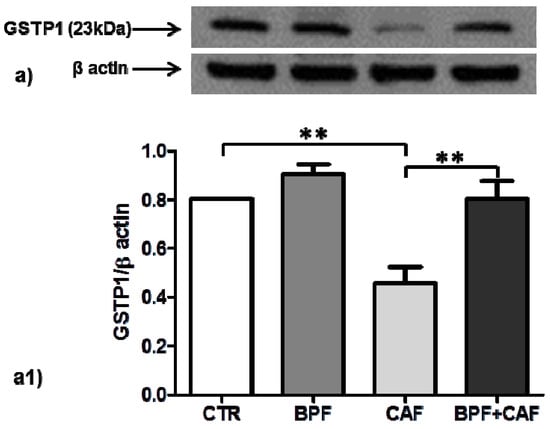 Monomeric GSTP1 expression in rat kidney. Western blotting of monomeric GSTP1 form (a) in the kidney extracts of CTR, BPF, CAF and BPF + CAF rats; (a1) shows the densitometric quantification of the blots. Protein loading was verified by using the anti-β actin antibody. Data are means ± SD of five determinations for each animal (n = 3). Statistical differences were evaluated by two-way ANOVA followed by Tukey’s multiple comparisons test (** p < 0.001).