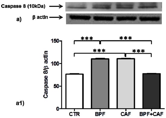 Caspase 8 expression in rat kidney. Western blotting of Caspase 8 active fragments cleaved (a) in the kidney extracts of CTR, BPF, CAF and BPF + CAF rats; (a1) shows the densitometric quantification of the blots. Protein loading was verified by using the anti-β actin antibody. Data are means ± SD of five determinations for each animal (n = 3). Statistical differences were evaluated by two-way ANOVA followed by Tukey’s multiple comparisons test (*** p < 0.0001).